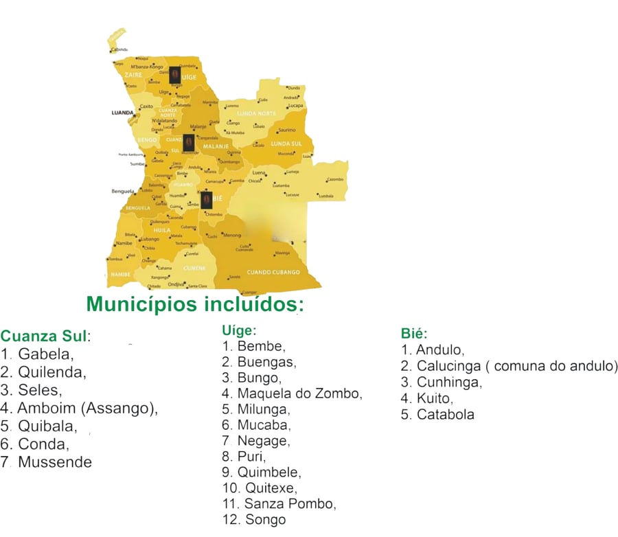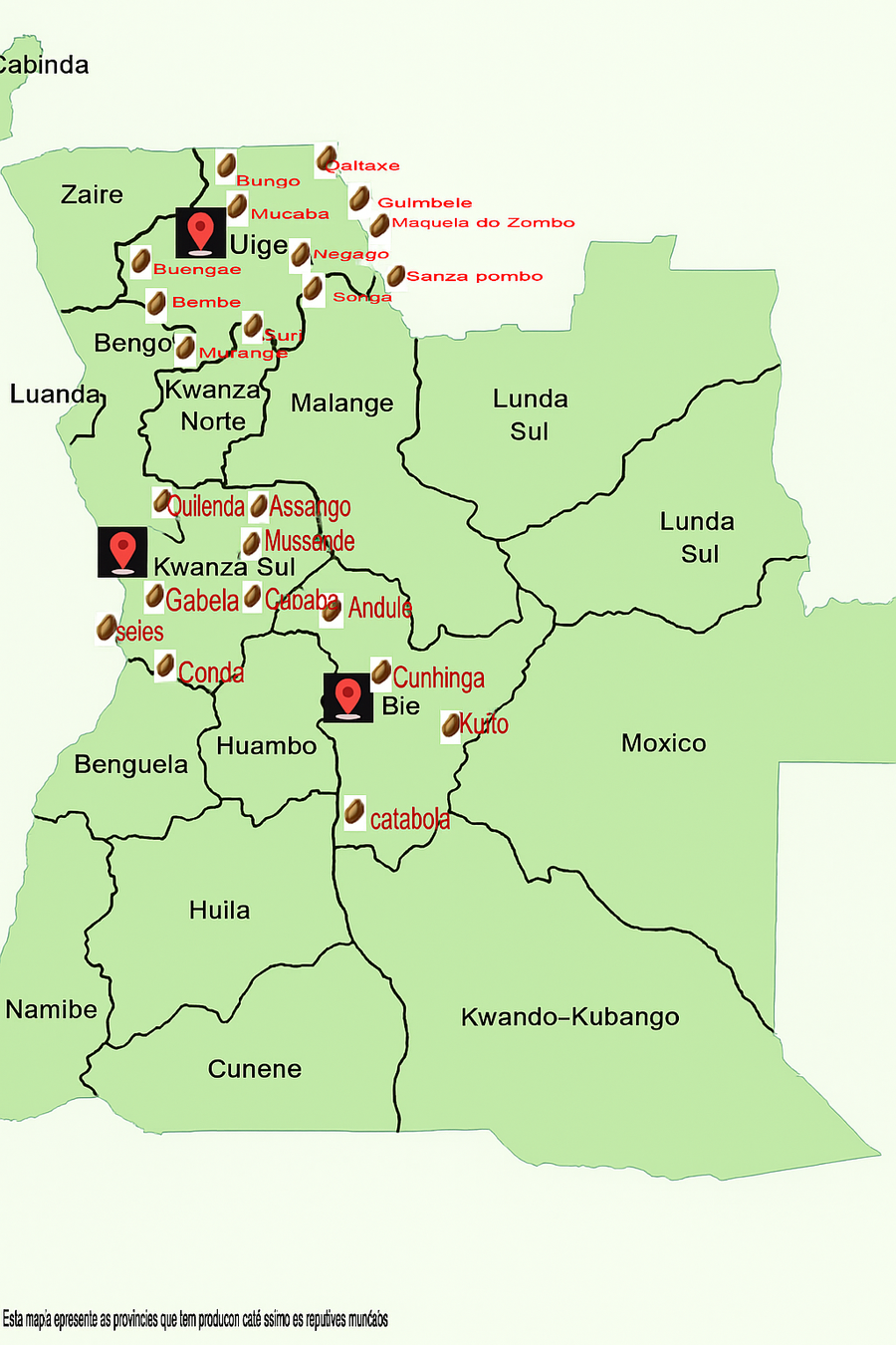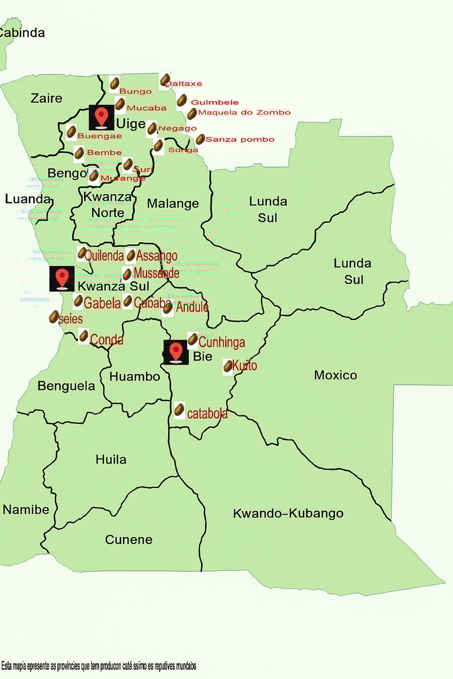 De kaart van Angola met de koffie regio's.